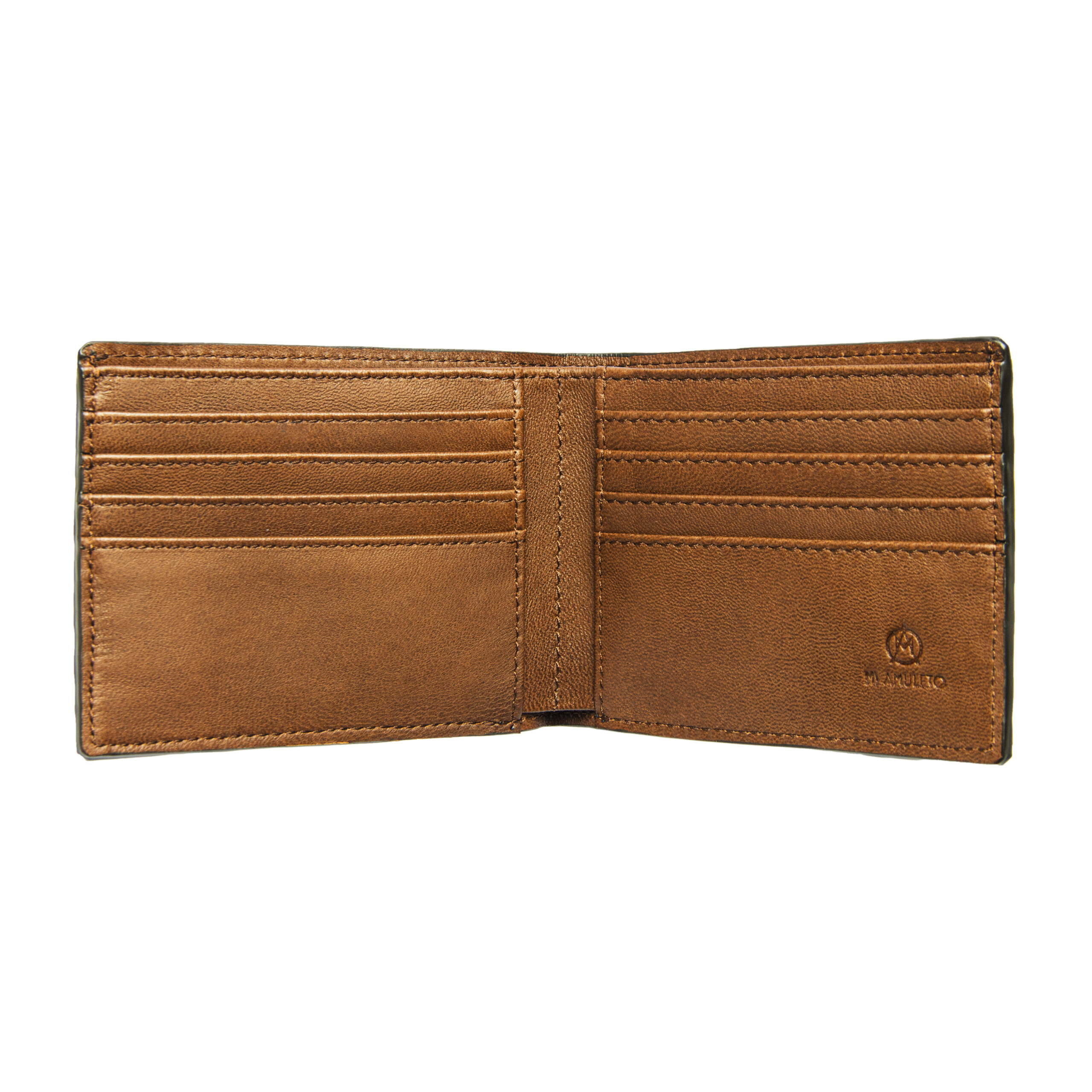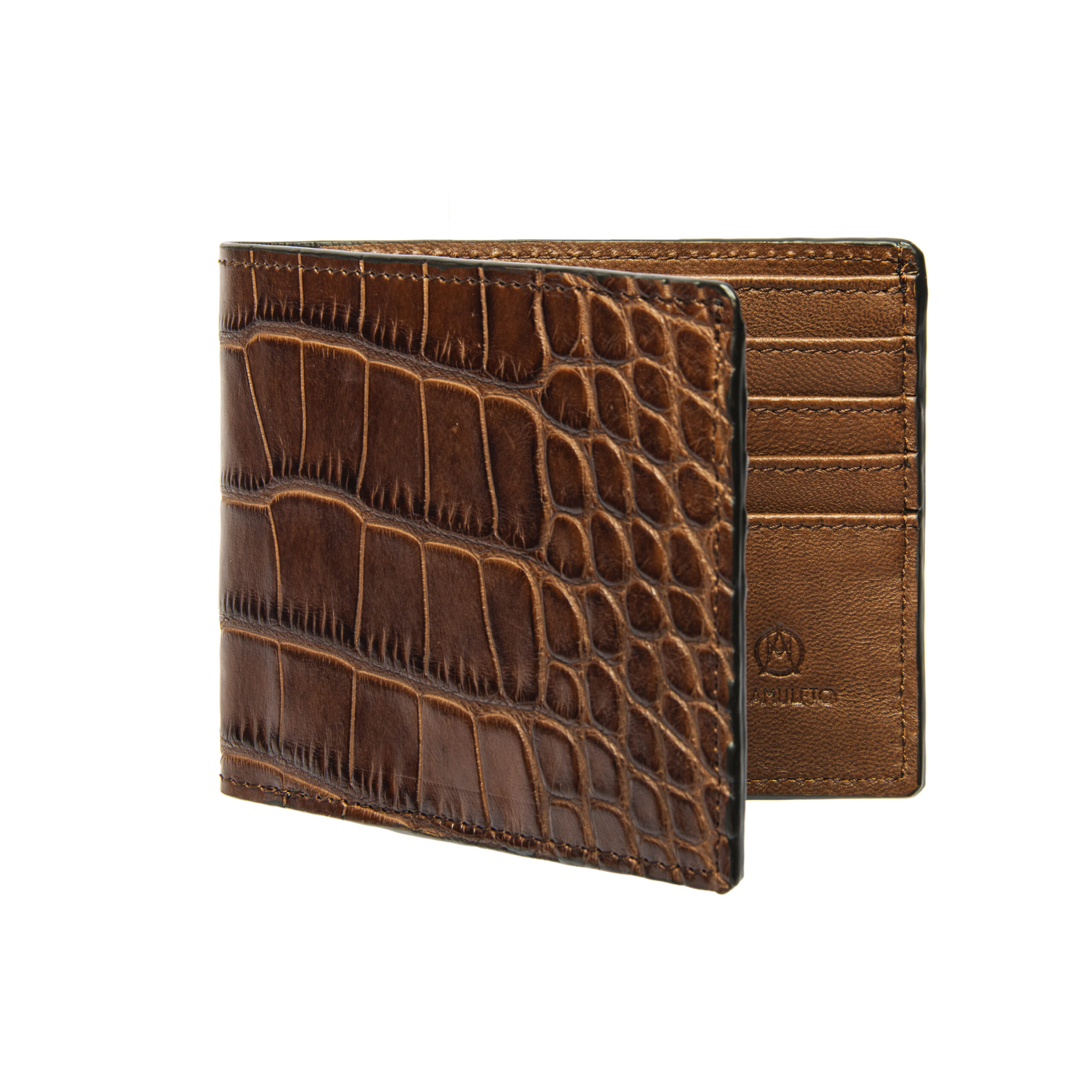 Cartera en piel cocodrilo american aligator color cafe interior cabra miel con compartimiento doble para billetes y espacio para 8 tarjetas.